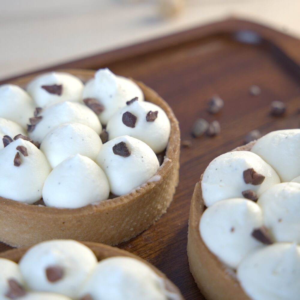 First, the crust is baked to a golden finish, offering a delicate crunch in every bite. Then, the velvety ganache adds depth with its bittersweet notes, creating a satisfying contrast to the light vanilla base. As a result, each slice offers balance, texture, and indulgence in perfect harmony.